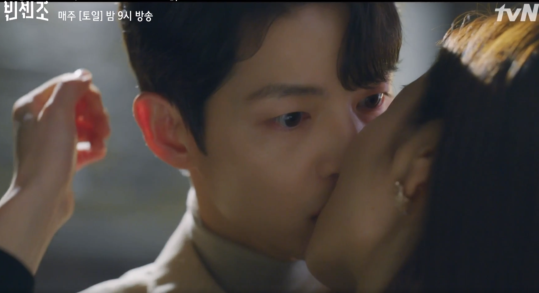 빈센조 14화에서 송중기(빈센조)와 전여빈(홍차영)이 키스했다. 빈센조는 tvN토일 드라마로 매일 밤 9시 방영된다. 조직의 배신으로 한국으로 오게 된 이탈리아 마피아 변호사가 베테랑 독종 변호사와 함께 악당의 방식으로 악당을 쓸어버리는 이야기인데, 빈센조와 홍차영은 커플처럼 행세를 하던 중 홍차영이 먼저 다가가 키스했다.