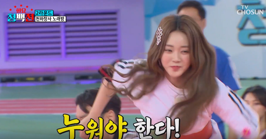 양지은의 홍지윤 지목으로 2라운드 천하장사 노래방 대결이 펼쳐졌다. 허리에 줄을 묶은 상태로 양 끝에 놓인 마이크를 먼저 잡는 사람이 노래한다. 양지은의 파워에 홍지윤은 쓰러지며 웃음을 자아냈었다.