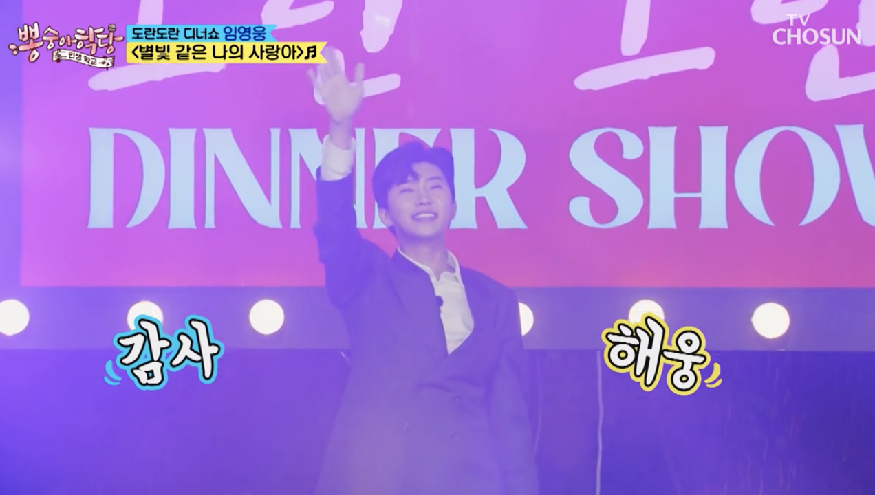 뽕숭아학당에서 임영웅이 도란도란디너쇼에서 별빛 같은 나의 사랑아를 선보였다. 뽕숭아학당은 수요일 최고 인기 프로그램으로 '미스터트롯'이 탄생시킨 '트롯맨 F4'가 초심으로 돌아가 대한민국 최고의 트롯 가수, 국민가수로 거듭나기 위해 배움을 이어가는 본격 성장 예능 프로그램이다. 이날 도란도란 디너쇼에는 이연복 셰프도 참여했다.